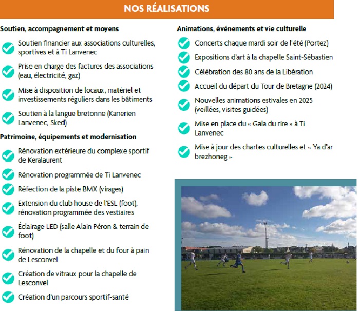 La culture et le sport renforcent le lien social et l’épanouissement. Malgré un contexte budgétaire tendu, nous avons revalorisé les subventions aux associations (4 139 adhérents) en 2025. Locmaria Ensemble poursuivra son engagement pour une commune dynamique, sportive et culturelle.