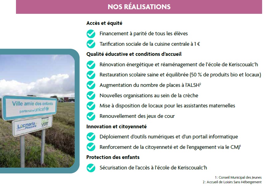 Nous avons mis l’accent sur l’accompagnement des familles, la qualité des services périscolaires et avons soutenu les écoles et les associations. Nous avons obtenu le label « Ville amie des enfants » de l’UNICEF. La commune a également favorisé l’engagement citoyen des jeunes du CMJ1 à travers des actions sociales, civiques et environnementales.