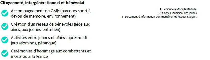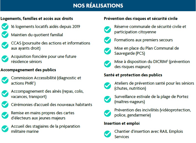 Notre équipe a veillé à l’inclusion des personnes en situation de handicap, à la construction de logements sociaux, au soutien des aînés, à la prévention des incivilités, à la création d’un réseau de bénévoles, à la mise en œuvre d’un chantier d’insertion et à l’organisation d’une participation citoyenne.